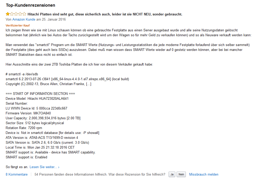 Holt schrieb:Das hättest Du längst wissen können, denn wir hatten dies schon öfter, seit dem Thread Neue HDDs vom Händler – wirklich unbenutzt?. Da ging es genau auch vor allem um diese uralten Hitachi Ultrastar 2TB.