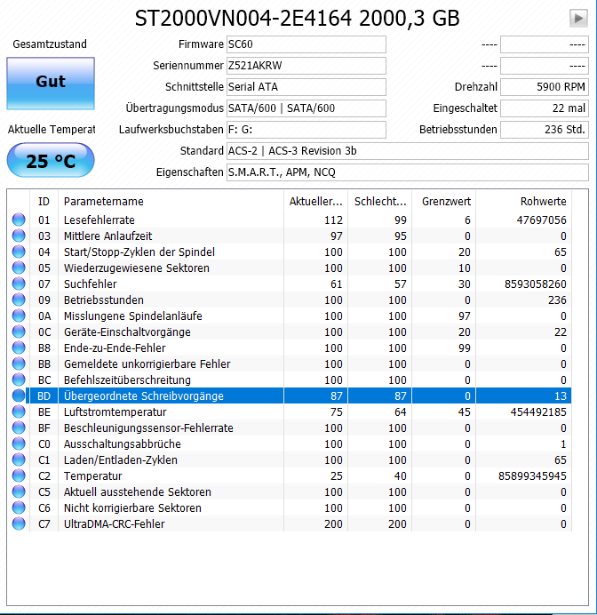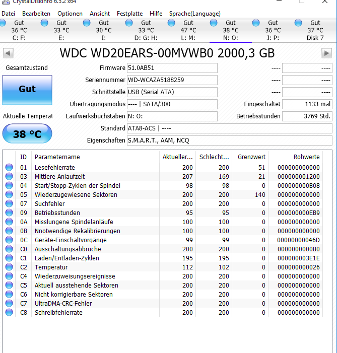 Platten in USB Gehäusen werden gerne mal zu warm, diese war maximal schon bei 68° und damit 3° über der maximalen Temperatur. Schlimmer ist aber, dass sie 2 Ende-zu-Ende Fehler hat, also Fehler auf den internen Datenpfaden! Hier hätte CDI waren und den Zusand als schlecht markieren sollen, ich würde sie umgehend reklamieren. Dann fallen mit viele Ausschaltungsabbrüche auf, also unerwartete Spannungsabfälle während denen die Köpfe nicht sowieso schon geparkt waren. Du solltest USB Platten immer über die "Hardware sicher entfernen" Funktion abmelden und erst abziehen, wenn Windows dies erlaubt. Meistens geht es zwar auch so gut, aber man kann auch beim nächsten Einstecken ein RAW Filesystem vorfinden und von der Aufforderung überrascht werden die Platte zu formatieren!