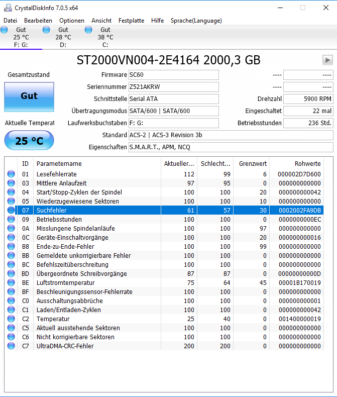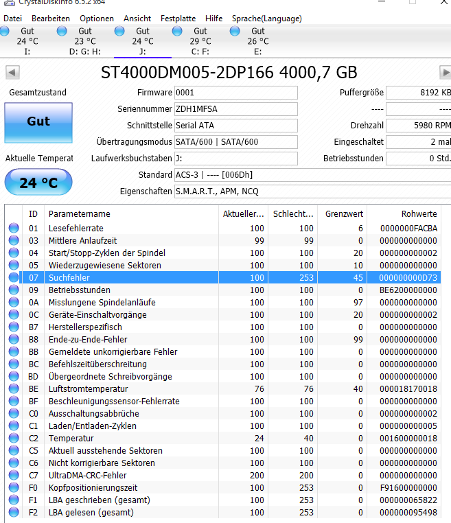 Es gibt nicht einen Suchfehler und auch keinen Lesefehler. Der Rohwert ist der Zähler der Lese- oder Suchfehlern ist bei den meisten Seagate HDDs aufgeteilt und zeigt bei der hexadezimalen Anzeige von CrystalDiskInfo nur in den 4 linken Stellen (die zwei höchsten 2 Bytes) wirklich die Fehler an und in den anderen 8 Stellen (4 Bytes) die Anzahl der Vorgänge. Da vorne jeweils 0000 im Rohwert steht, hat diese HDD also keine Lese- oder Suchfehler.