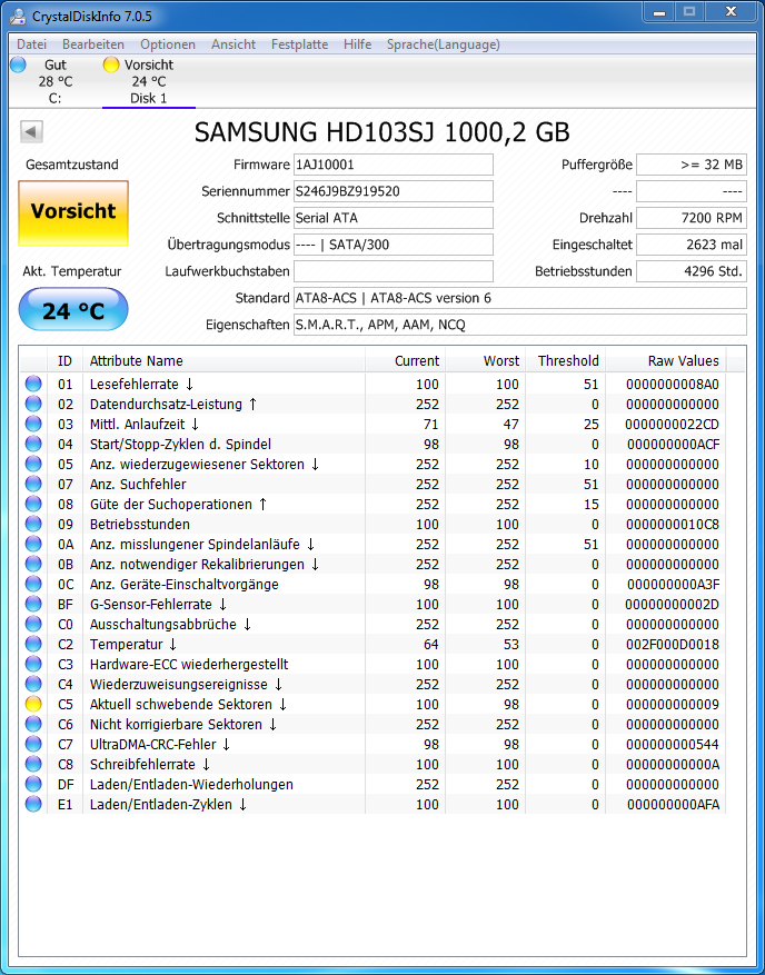 Die zweite dürfte die 5 Jahre vorgesehener Nutzungsdauer hinter sich haben, aber 9 schwebende Sektoren sind alleine noch kein Grund sie zu entsorgen, denn Schwebende Sektoren sind erstmal nur Sektoren deren Daten nicht mehr zur ECC passen die hinter jedem Sektor steht und mit deren Hilfe auch nicht mehr korrigiert werden können. Da die korrekten Daten nicht mehr feststellbar sind, gibt die Platte statt falscher Daten einen Lesefehler als Antwort wenn man versucht diese zu lesen. Das kann auch anderen Gründe als defekte Oberflächen haben, z.B. einen Stromausfall während eines Schreibvorgang der dazu führt, dass eben nicht die ganze Daten plus der neuen ECC geschrieben wurden oder wegen eines Stoßes oder Vibrationen ist der Kopf beim Schreiben aus der Spur gekommen und hat Daten auf der Nachbarspur überschrieben. Diese HDD ja einige davon erlebt.