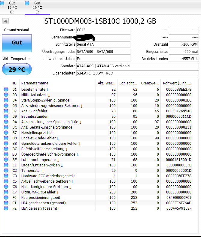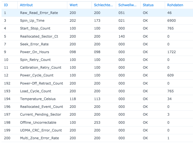 Aber achte auf den Rohwert von C7 (UltraDMA CRC Fehler), denn der ist relevant, nicht so sehr der aktuelle Wert. Wenn es ewig gedauert hat, könnte es an Kabelproblemen bei einer anderen Platte liegen oder auch an der Backplane des Hot-Swap Rahmens, die machen auch manchmal Probleme.