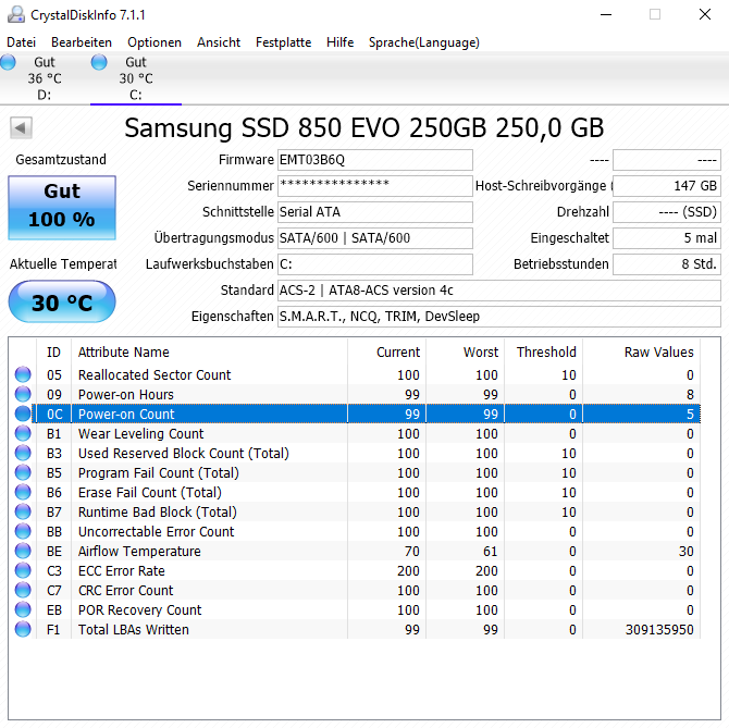 Du meist hoffentlich die Rohwerte, aber ich würde Dich bitten nächstes mal vor dem Erstellen des Screenshot dann doch das Fenster so weit aufzuziehen, dass man alle Attribute sehen kann. Denn ich kann mir kaum vorstellen, dass auch der Rohwert von E8 noch 0 ist, es also bei über 2200 Einschaltungen niemals einen unerwarteten Spannungsabfall gegeben haben soll.PoD-BoT schrieb:(Die nicht ersichtlichen Werte sind alle 0)