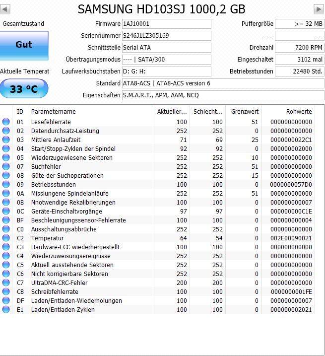 Wieso sollte da was sein? Der Aktuelle wie der schlechteste Wert sind weit über dem Grenzwert. 400 sind keine 10% und der schlechteste Wert von 178 zeigt, dass es auch schon mal noch größere Unterschiede gab, der Spinip also auch schon mal noch länger gedauert hat. Die Unterschiede können z.B. durch Spannungsschwankungen und Temperaturunterschiede entstehen, hier ist beim Spinup also nichts ungewöhnlich.Cool Master schrieb:Die Spin_up_time evtl. auch etwas. Da sollte kein unterschied von ~400 sein.