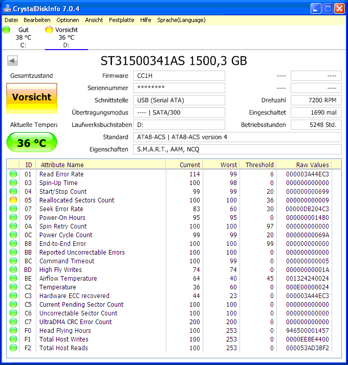 Was soll das beheben? Die Lesefehler sind aufgetreten und werden nicht aus dem Rohwert von Attribut 1 verschwinden, da beim Formatieren geschrieben aber nicht gelesen wird und es bisher keine Schreibfehler gab, werden dabei kaum neue Lesefehler auftreten. Das Formatieren macht Sinn um die Daten zu löschen, aber kann hier keinerlei Probleme beheben, die wäre vielleicht der Fall wenn es schwebende Sektoren gäbe.Cool Master schrieb:würde ich mal die HDD komplett (langsam) formatieren, also kein Quick Format und schauen ob das das Problem beheben kann.