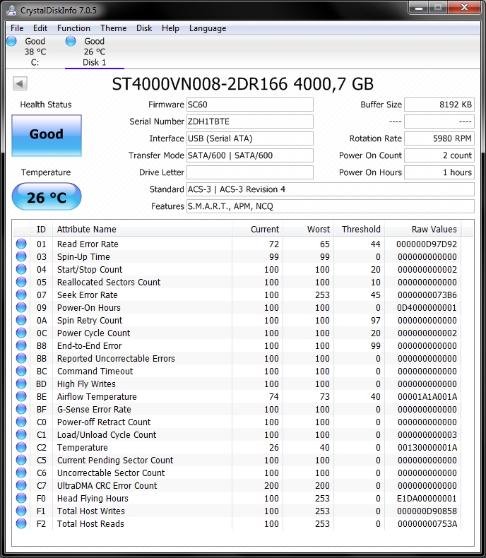 Da würde ich erst mal schauen ob sich der Rohwert vom Attribut C7 ändert und dann ob die Stecker richtig sitzen. ox1F = 31 wiederzugewiesene Sektoren sind jetzt ja auch noch nicht so dramatisch viele, wenn da nicht in kurzer Zeit viele hinzu kommen, kann sie noch eine Weile halten. Wenn es aber neueres Mainboard ist bei dem aktuelle SATA Platten ohne Probleme laufen, würde ich sie ersetzen.Jesterfox schrieb:Bei dem nicht erkennen würd ich auf ein Problem mit dem Kabel tippen, das C7 Attribut zeigt viele CRC Fehler an (wobei man da leider nicht sagen kann wann das passiert ist, wäre aber naheliegend das es mit dem aktuellen Problem zusammenhängt). Häng sie doch mal mit einem neuen Kabel nochmal intern rein ob sie dann erkannt wird.