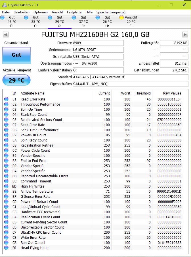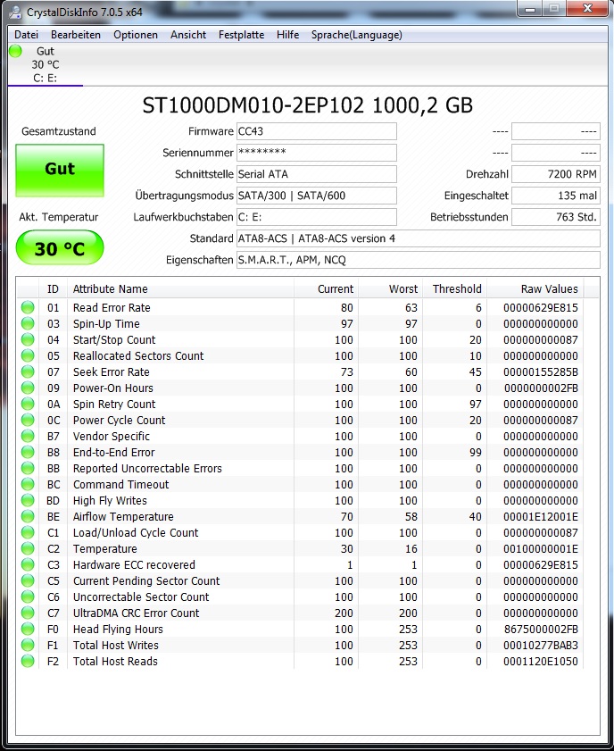 ID BF: 253 (0xFD); CB ist die Anzahl der ECC, die läuft ja immer mit, daher der utopische Wert; ID 05: 2000 Reservesektoren verfügbar; ID 01: 73.311 Lesefehler; ID 07: 862 Suchfehler; ID C8: 8342 Schreibfehler; ID C4: 6875 Versuche nicht lesbare Sektoren durch Reservesektoren zu ersetzen.