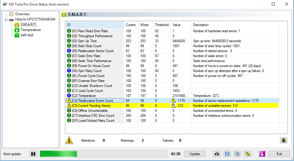 Ich habe ein Problem mit meiner Hitachi Festplatte meines alten Acer Espire Laptops. Die SMART Werte sehen folgendermaßen aus:
