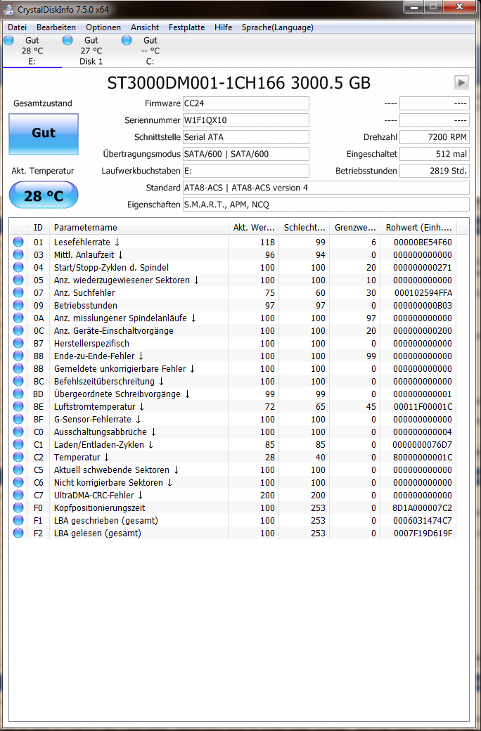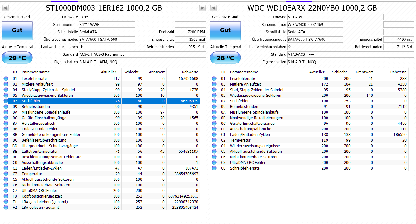 Kritisch sehen für mich die Werte Read-Error-Rate und Seak-Error-Rate aus.