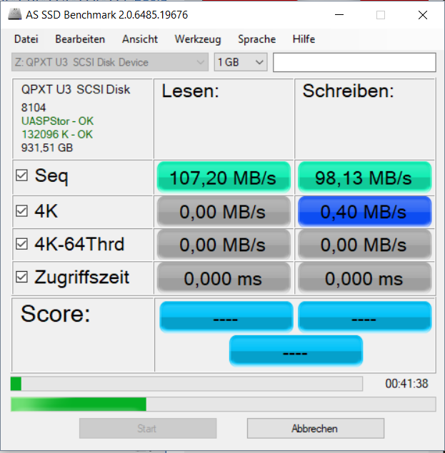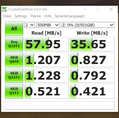 Der Benchmark wurde über einen USB-Sata-Adapter mit Stromversorgung gemacht, ich weiß nicht, ob der vllt. Ergebnisse beeinflusst.