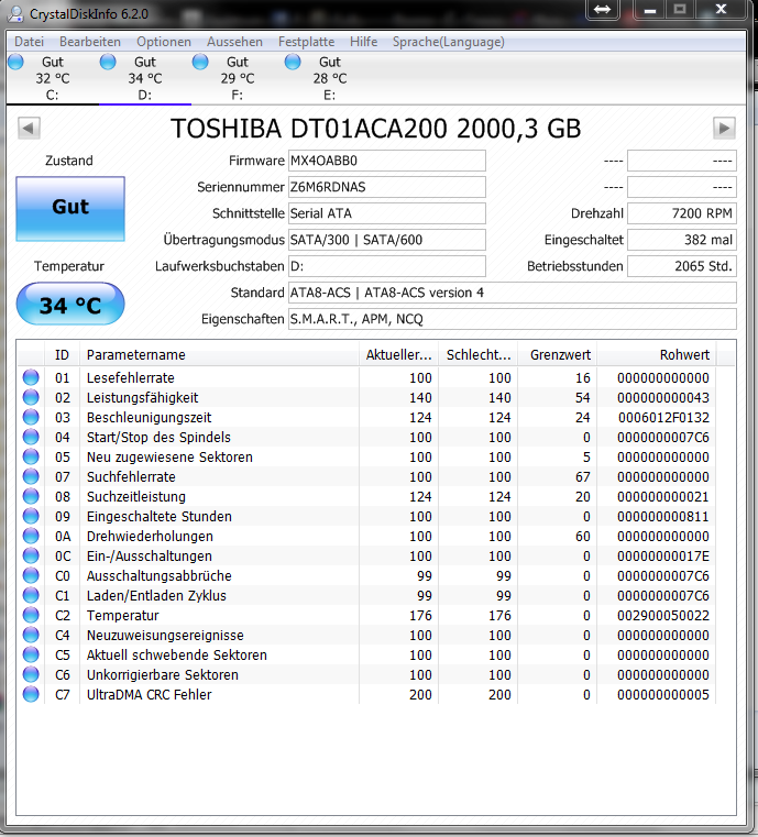 Die Platten sehen eigentlich alle gut aus. Bei der ACA200 gab es 5 zurückliegende CRC Ereignisse.