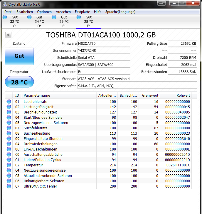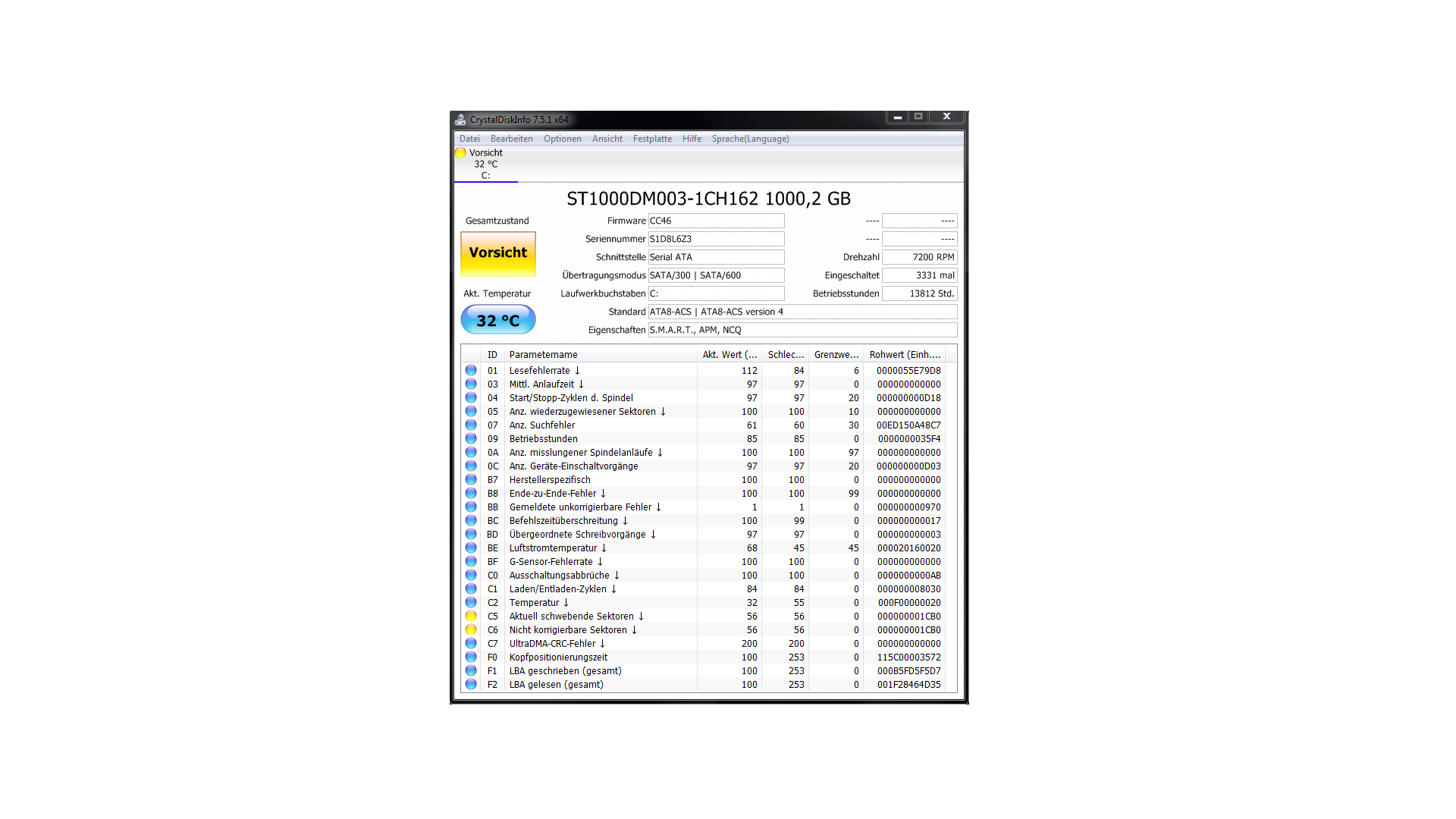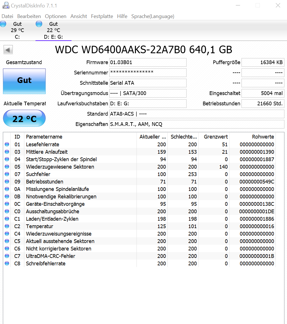 Die Werte sind gut, nur C7 zeigt an, dass es mal ein Problem mit dem Datenkabel gegeben hat oder immer noch gibt. Wenn der Rohwert von C7 steigt, ist es aktuell vorhanden, prüfen dann ob ein Stecker des SATA Datenkabel lose ist und wenn nicht, tausche es aus. Die Platte dürfte zwar schon alt sein, kann aber noch eine Weile halten, auch eine ganz neue HDD kann ausfallen, vor allem wenn sie schlecht behandelt wurde, etwas weil sie schlecht verpackt verschickt worden ist. Weil jede Hardware jederzeit auch mal spontan ausfallen kann und weil nicht nur Hardwareausfälle die Daten bedrohen, ist ein Backup aller wichtigen Daten die man nicht verlieren möchte, sowieso immer Pflicht. Ein sinnvolles Backup gehört immer auf ein Medium welches in einem anderen Gehäuse steckt als das Medium mit den Originaldaten.