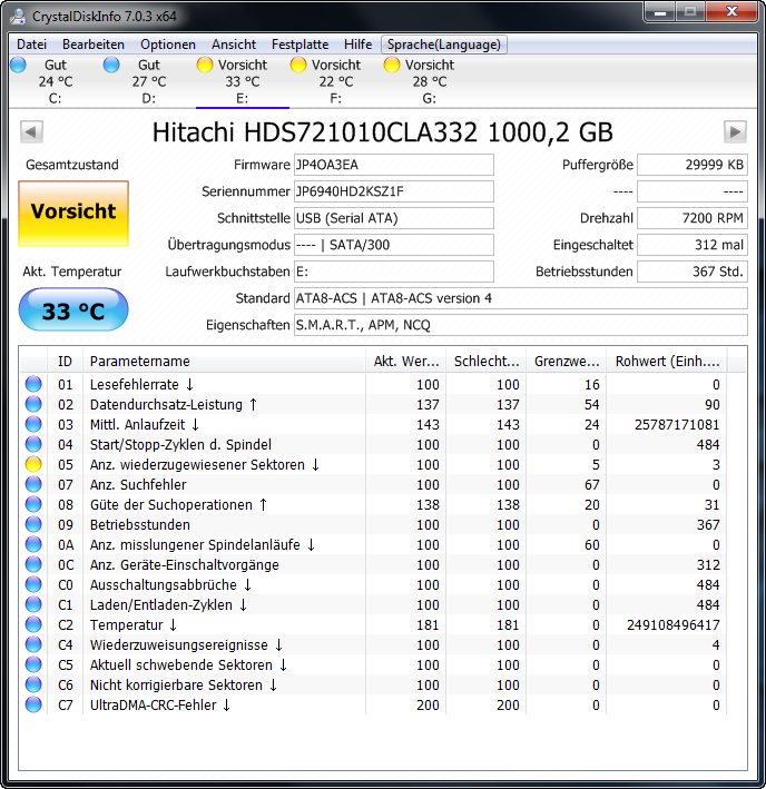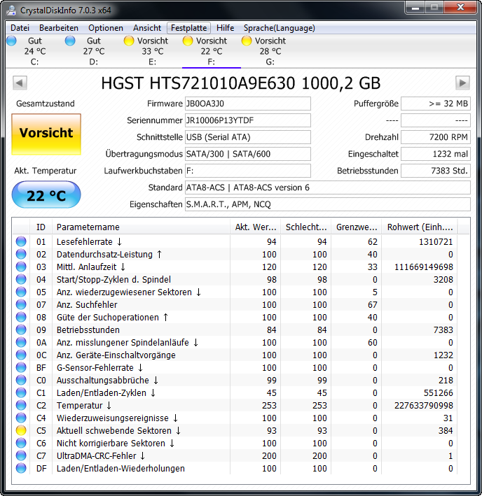 Deswegen hab ich mir mal CrystalDesk installiert und mir die Werte angeguckt (meine HDD ist jetzt schon mehrere Jahre in Benutzung). Bei mir steht "Vorsicht" (siehe Anhang). Da ich nicht gerade der reichste Mensch bin, muss ich mir mit meinem Geld einplanen, was ich im Laufe der Zeit als erstes an Hardware besorge (brauche einige Teile, um meinen PC aufzurüsten). Wollte jetzt mal nach eurer Meinung fragen, ob es Zeit wäre, mir ne neue Festplatte anzuschaffen. Wenn nicht würde ich die Priorität auf eine andere Komponente legen. Aber was bringt mir dann ein neuer Prozessor, wenn die HDD ganz defekt wird? Also...