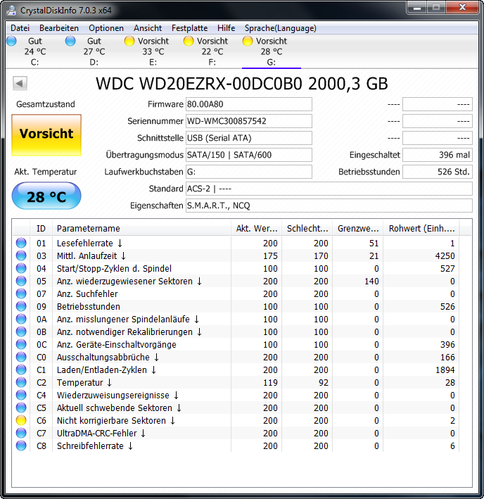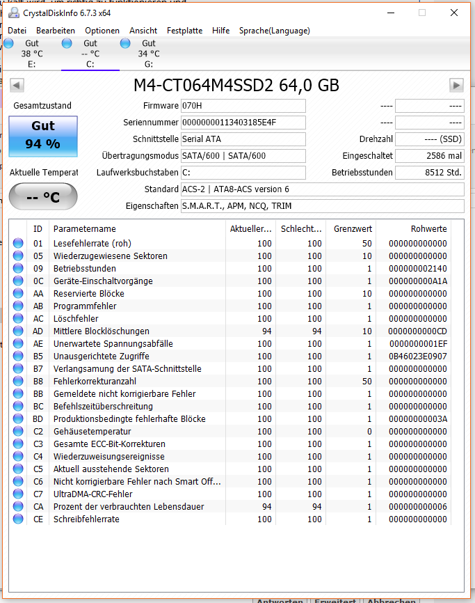 Obwohl sowohl bei E und G eine kleinere Anzahl von Fehlern auftaucht die angesichts der bisher geringen Betriebszeiten unbefriedigend sind erscheint F deutlich am wenigsten gut. 140001 Lesefehler und 384 Sektoren können nicht gelesen werden, hier einmal Daten wegsichern und 1x vollständig Überschreiben, dannach SMART Werte neu erheben, die C6 sollten verschwunden sein, andernfalls dann noch einen Screenshot posten.