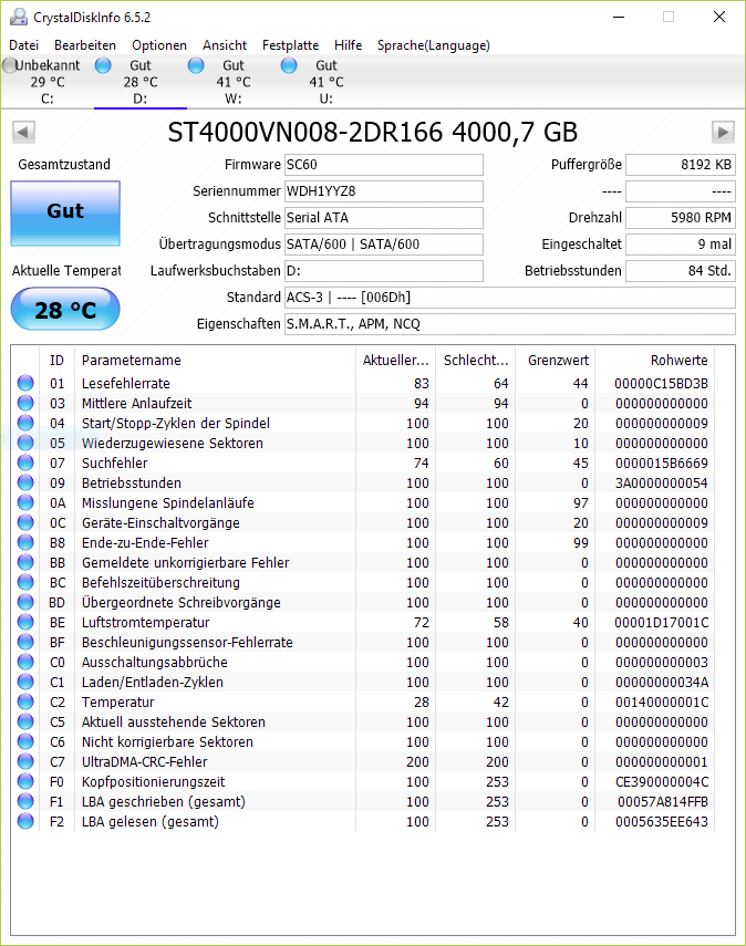 Ich wundere mich gerade über die Werte der Festplatte. Ist eine Seagate IronWolf NAS HDD 4TB, SATA 6Gb/s (ST4000VN008). Die Rohdaten der Lesefehlerrate ändern sich wie verrückt. Was ist da wichtiger, die Werte vorne oder Rohdaten? Das selbe bei Kopfpositionierungszeit.