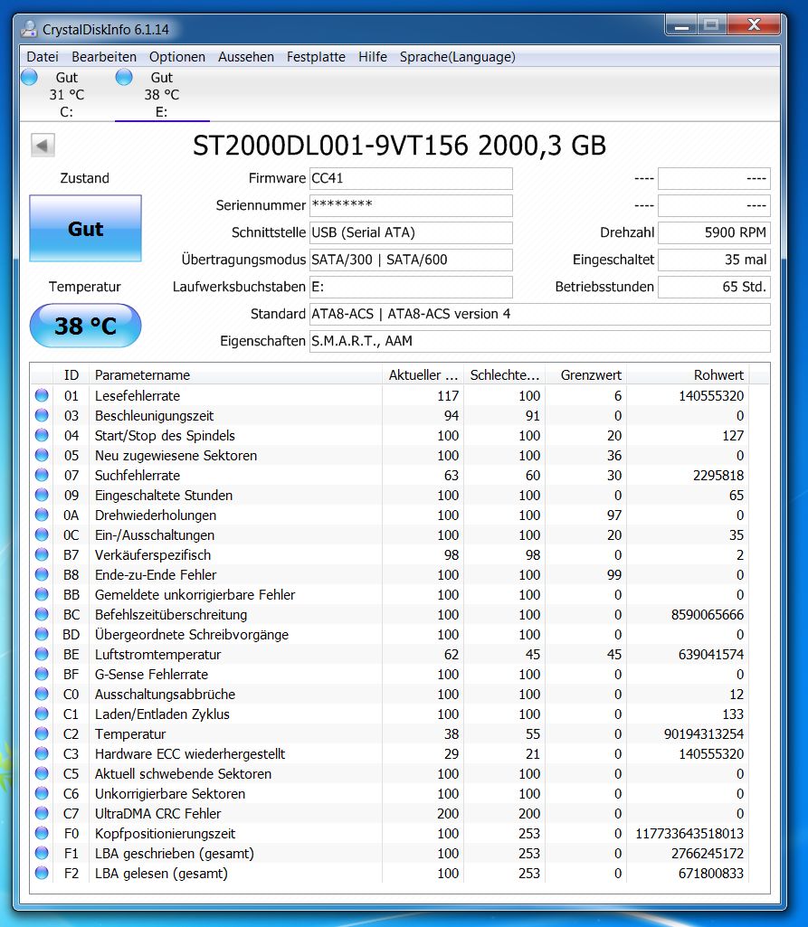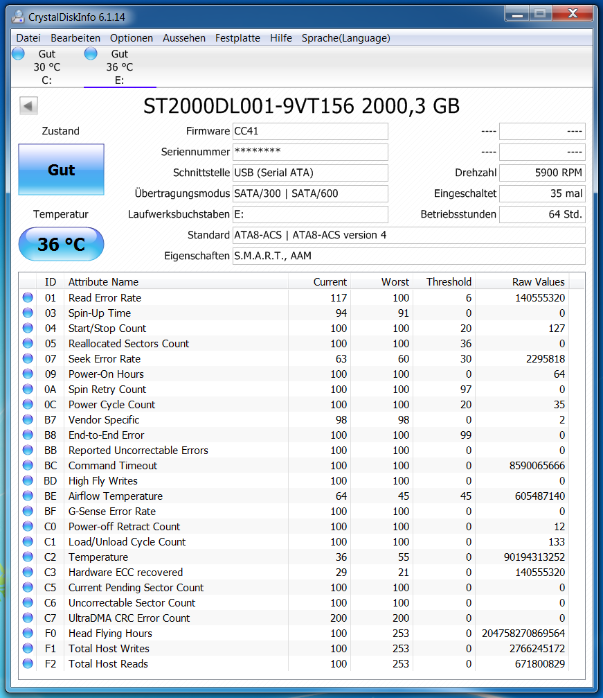 - Zu Beginn 2B schwebende Sektoren, 29 G-Sense Fehlerrate, 45 Festplattenverschiebung (alles hexadezimal).