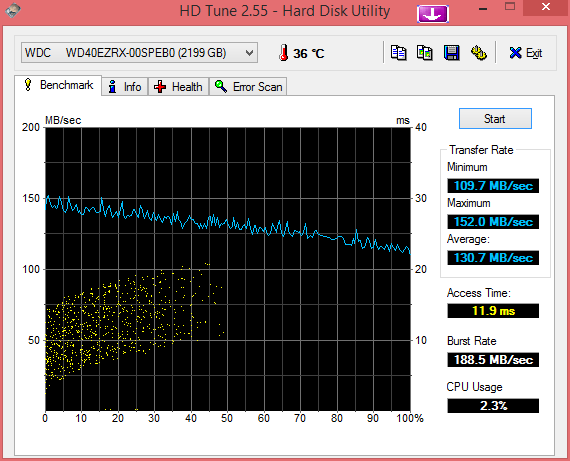 Das Problem ist, das HD Tune in der alten (verbuggten) 2.55 Freeversion nur maiximal 2TiB adressieren kann, es wurden also von der 4TB nur etwas mehr als die erste Hälfte der Kapazität gebencht. Daher liegt auch der Unterschied zwischen Min und Max nicht beim üblichen Faktor 2. Wenn das passiert, sollte man immer hellhörig werden, da das nur bei Platten mit Short-Stroke üblich ist.