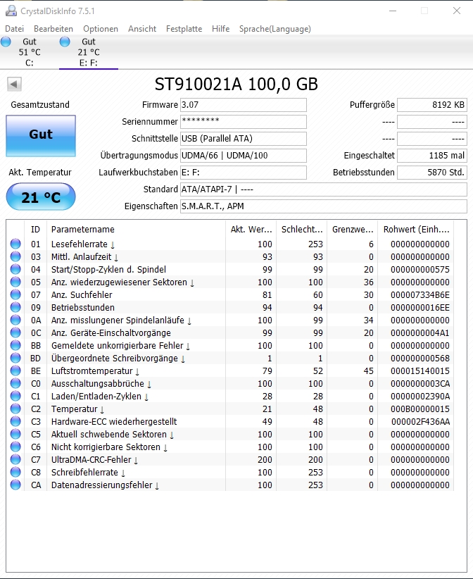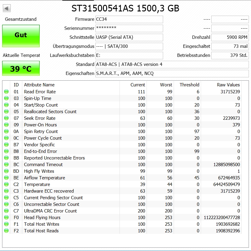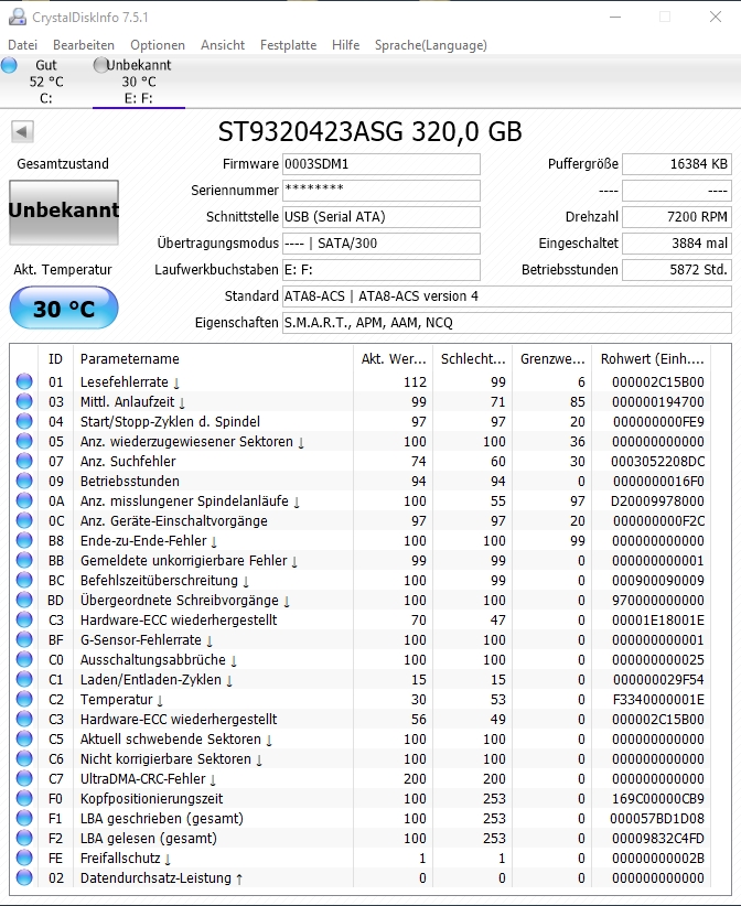Folgendes. Ich habe heute meinen Laptop gestartet und musste feststellen, das meine Seagate nicht mehr erkannt wurde. Bzw. im Explorer nicht aufgelistet (ebenfalls in der Datenträgerverwaltung). Ich habe den Laptop neu gestartet, und siehe da, Festplatte wieder da. Da ich aber dabei ein ungutes Gefühl hatte, habe ich Disk Info gestartet und bekam folgendes zu sehen: