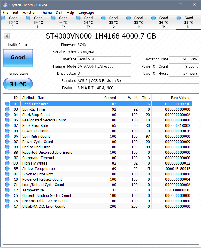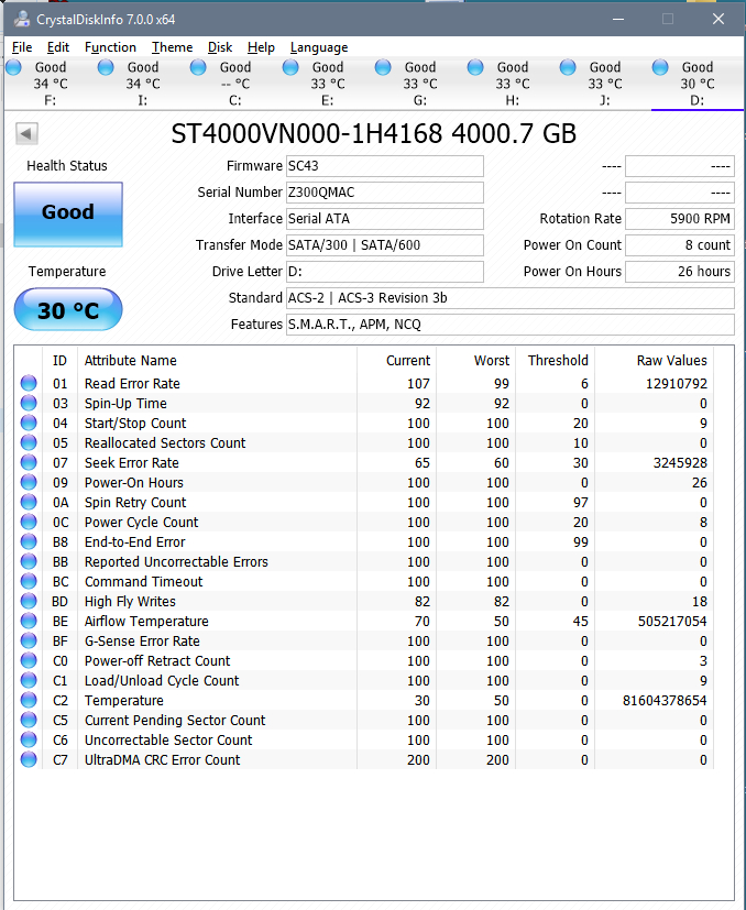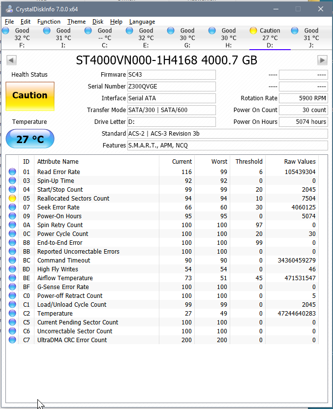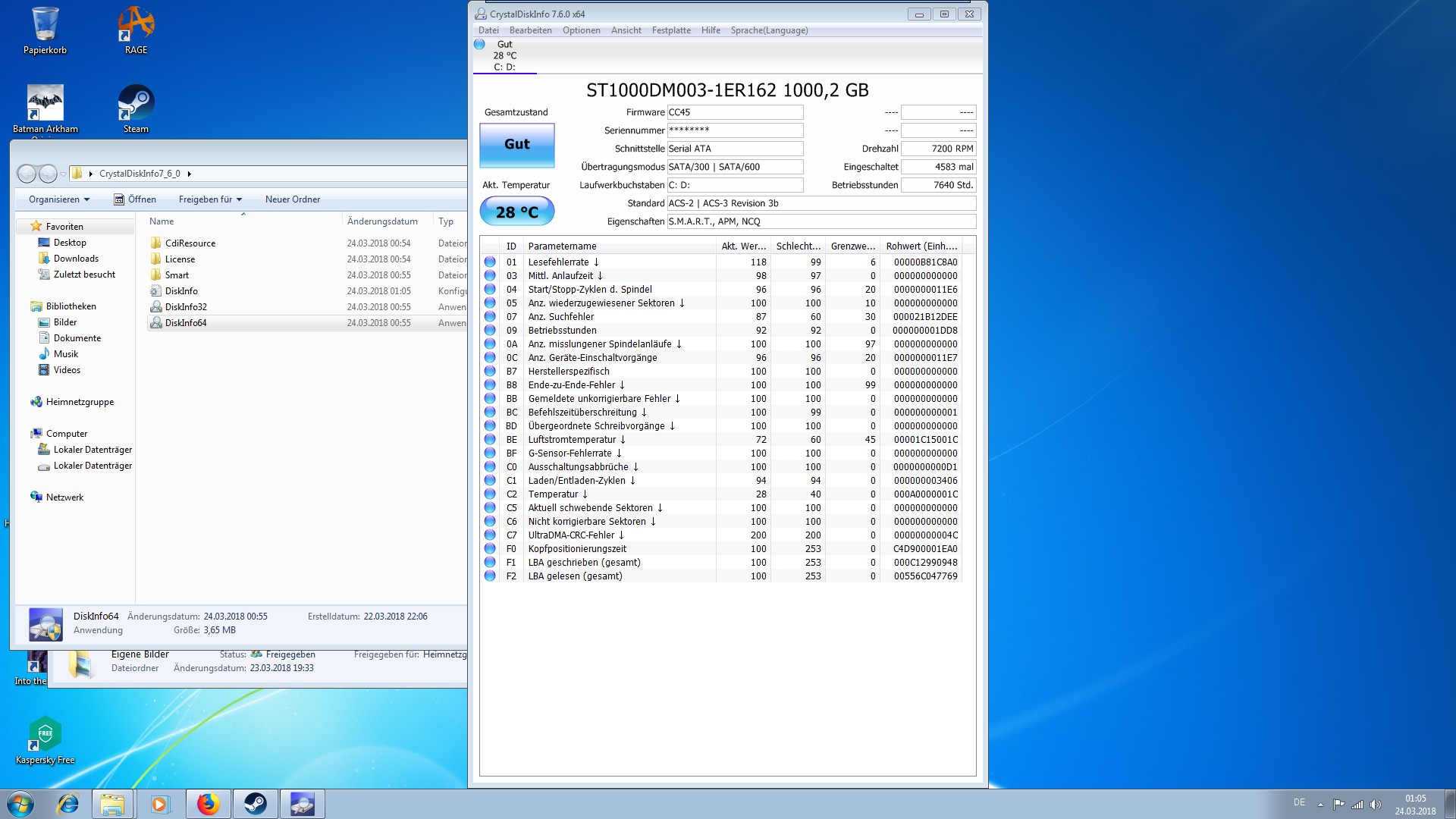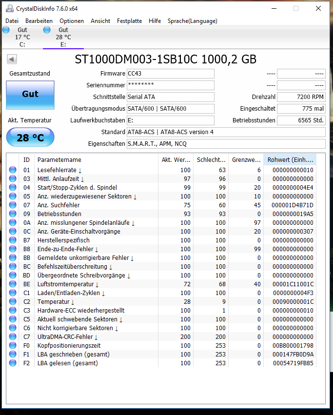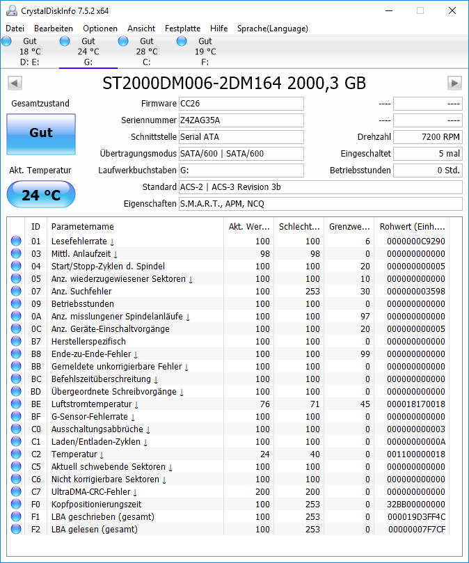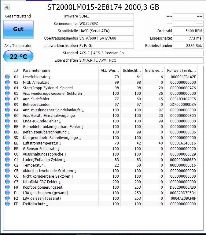 Die TBW sind nur für die Garantie relevant, die beträgt nur 3 Jahre und ist sowieso abgelaufen. Für den Zustand sind die verbrauchten P/E Zyklen wichtig, die stehen im Rohwert vom Attribut AB und der ist 0x01E2 = 482, der Aktuelle Wert von 84 gibt an, dass noch 84% der Spezifizierten P/E Zyjlen der NANDs übrig sind, wenn Du also so 5% der P/E Zyklen pro Jahr verbraucht hast, hast Du noch spezifizierte für die nächsten 17 Jahre übrig. Aber selbst dann sind die ANNDs noch längst nicht am Ende, bei allen SSDs von NAND Herstellern oder deren Tochterfirmen von denen ich bisher Endurancetests gesehen habe, hielten die NANDs mindestens 2 bis 3, bei einer Crucial m4 sogar 12 mal so viele P/E Zyklen wie spezifizieert aus, bevor die SSD platt war, rechen beim bisherigen Verbrauch also noch mal mit locker nochmal 20 Jahren nach den 17 Jahren, wenn die spezifizierten P/E Zyklen verbraucht sind.