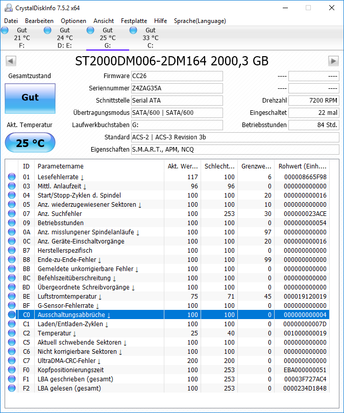 Ich würde mal eine neue Version con CrystalDisk laden, die aktuelle ist 7.6.0. Abgesehen von den Umdrehungen, was ein Auslesefehler ist, sieht da alles super aus.
