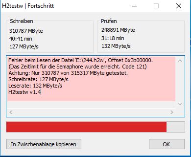 Zwangsweise, weil ich den PC über den Startknopf ausdrückt und neugestartet habe. Nach der Fehleranzeige bei H2Testw ließ sich die Festplatte nicht mehr auswerfen, sich blinkte nur noch vor sich hin. Programme wie ChrystalDiskInfo wollten nicht mehr starten. Ich bin dann auf PC Herunterfahren gegangen aber es wurde nichts mehr ausgeführt, dann habe ich ihn ausgedrückt.