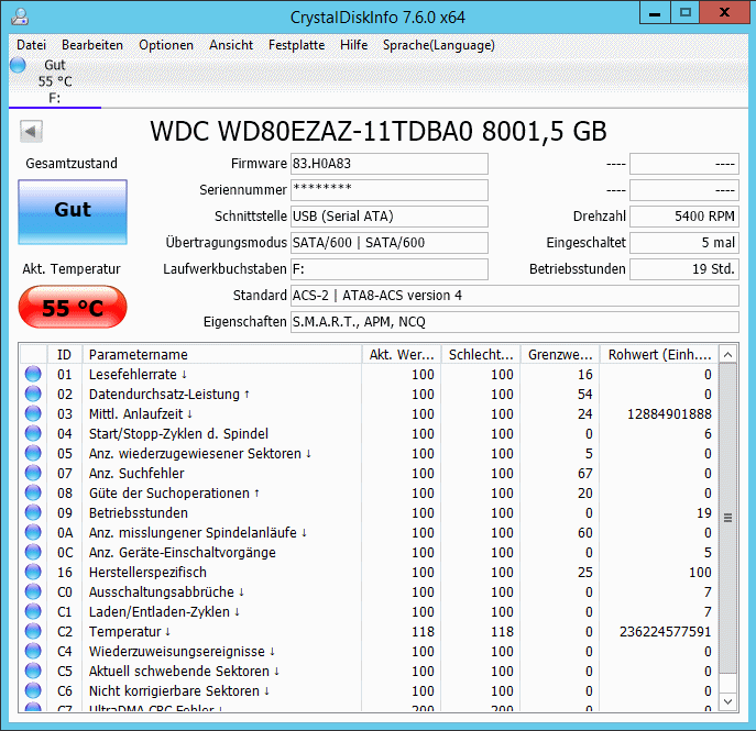 Ich habe jetzt kein direktes Problem mit der Festplatte, aber ein indirektes mit den SMART Temperaturwerten. Hab diese WD My Book Desktop 8 TB Platte gekauft. Einzig als Backup und Datengrab. Wird also 1x im Monat angeschlossen und für 10-12 Stunden befeuert.
