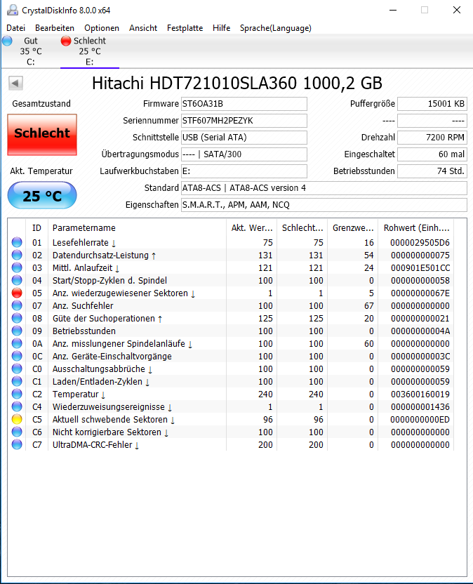 - beim Start des PC (wenn die Hitachi per SATA verbunden ist) erscheint die S.M.A.R.T-Meldung: