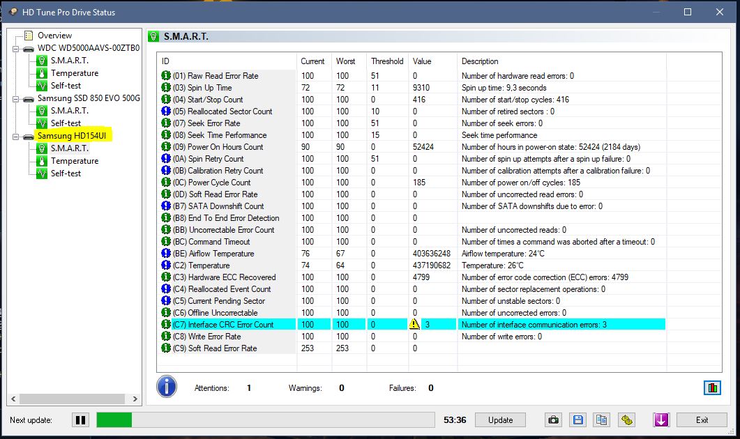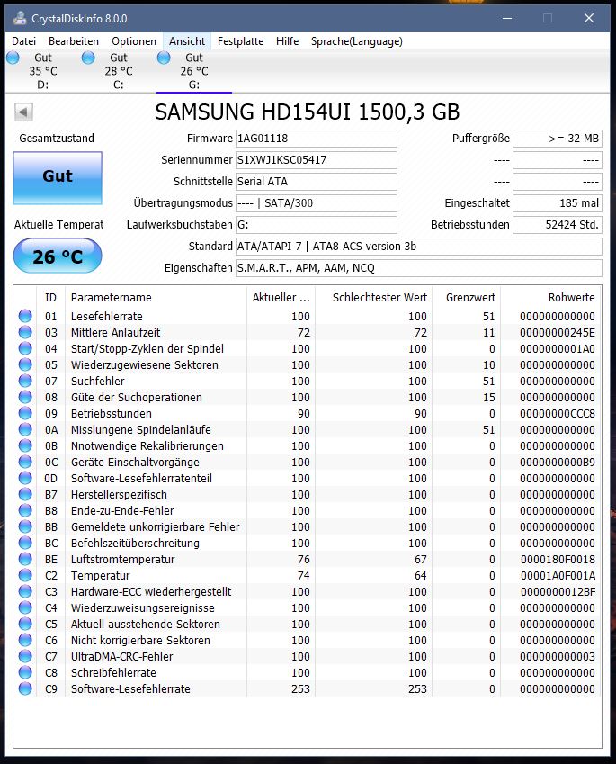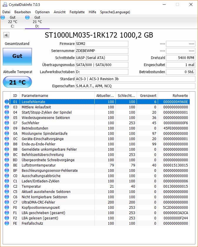 Nein, muss man nicht. Screenshot von CrystalDiskInfo für die SSHD, ziehe aber bitte das Fenster soweit auf, dass alle Attribute und auch die Rohwerte vollständig sichtbar sind, also keine Scrollbalken mehr erscheinen. Bitte mache den Screenshot aus Windows und nicht mit einer Kamera vom Bildschirm und nur den Screen von CrystalDiskInfo, mit Alt+Druck erzeugt Windows einen Screenshot des aktiven Fensters in der Zwischenablage oder probiere mal die Tastenkombination: 'Windows Taste + Shift + S'.Threat schrieb:Genauere Infos konnte ich nicht auslesen, sonst müsste ich ihn mal aufmachen.