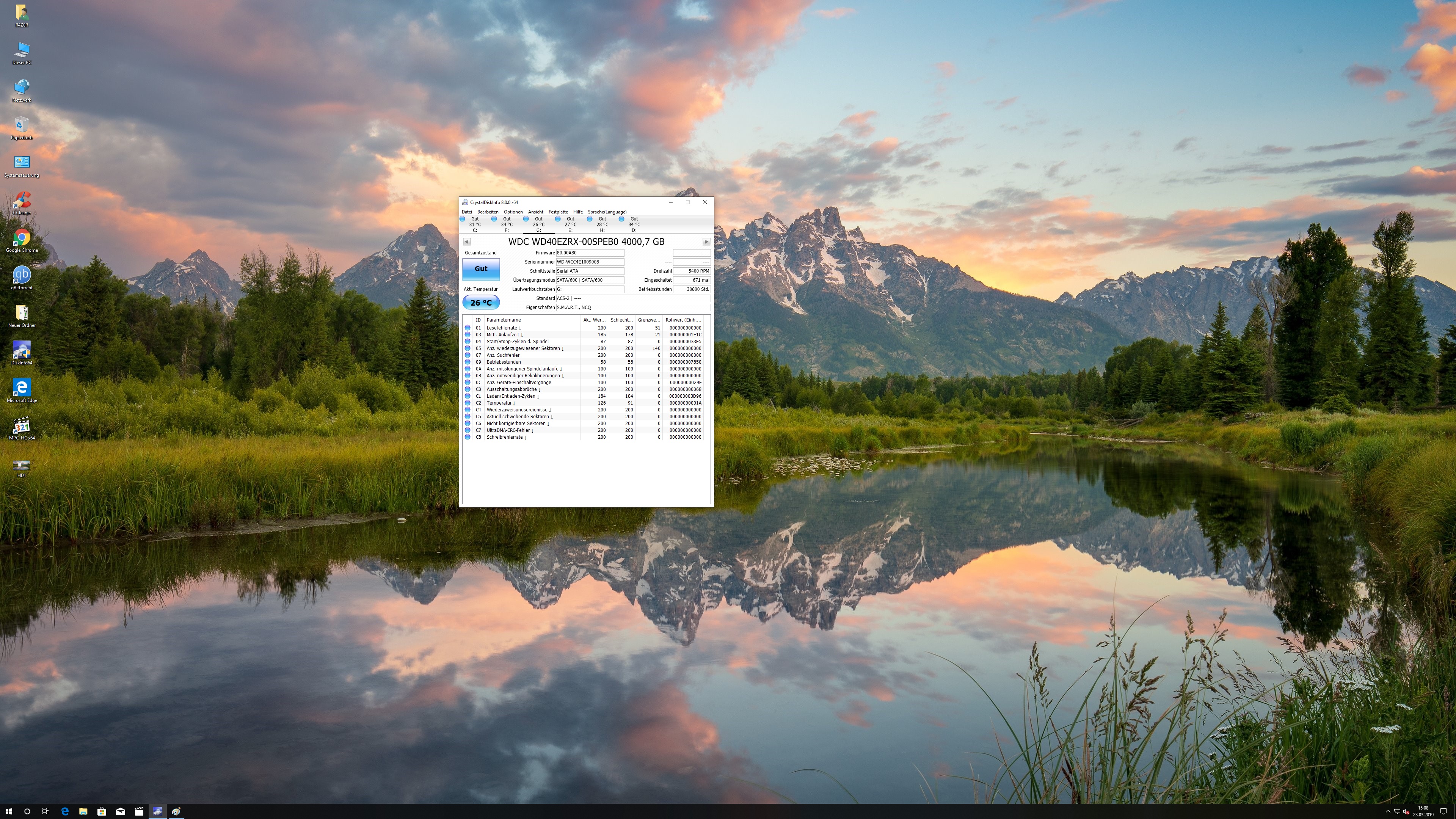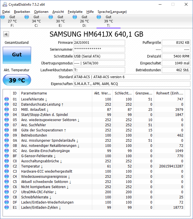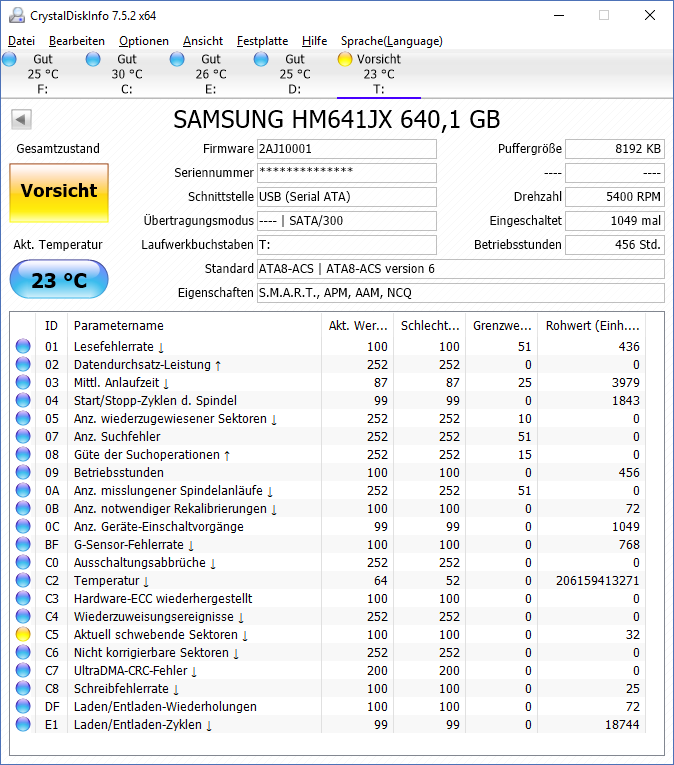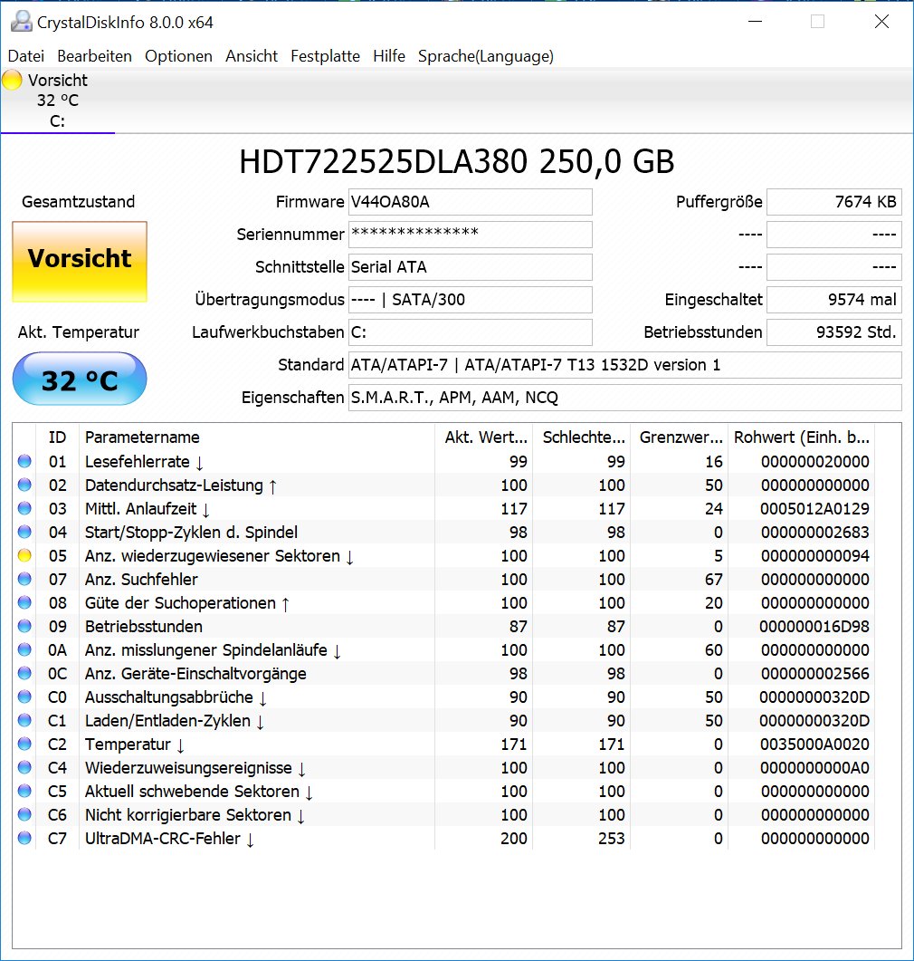 Bei meiner Festplatte zeigt Crystal DiskInfo "Vorsicht".