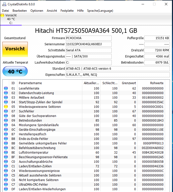 Ja und bei wirklich mobil genutzten Notebooks ist dies auch nicht ungewöhnlich. Dies dürfte auch die wiederzugewiesenene Sektoren erklären, außerdem ist es noch eine Hitachi, also eine aus der Zeit vor dem Verkauf der Festplattensparte an WD, denn im Zuge des Verkaufs wurde diese in HGST umbenannt. Die hat also ihre vom Hersteller geplante Lebensdauer hinter sich und daher würde ich sie durch eine SSD ersetzen, die stören sich nicht an den Stößen und eine ordentliche wie die MX500 500GB kostet ja nun auch nicht die Welt und man kann sie dann ins nächste Notebook übernehmen.fanatiXalpha schrieb:Der Beschleunigungssensor hat auch ordentlich oft ausgeschlagen