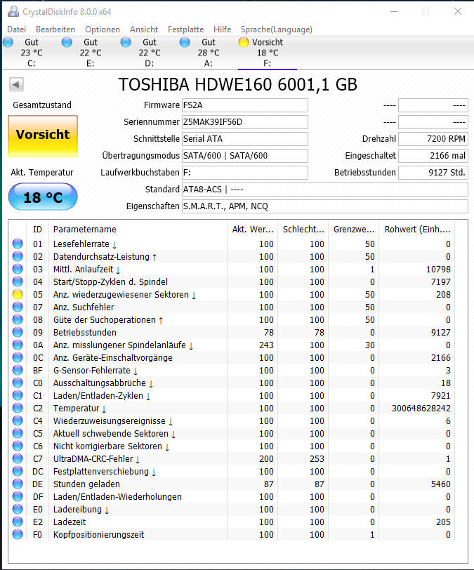 Vergiss das Schrotttool. Die 65% dürfte dem Aktuellen Wert der Suchfehler entnommen sein. Nur die erste hat 10 Suchfehler, aber Desktopplatten wie die DX Reihe sind eben auch nicht gegen die Vibrationen geschützt, die die anderen HDDs im Gehäuse erzeugen und da kann der Kopf schon mal aus der Spur kommen.Trichter schrieb:HDD Health gibt für beide Platten ca. 65% "Restqualität" an.