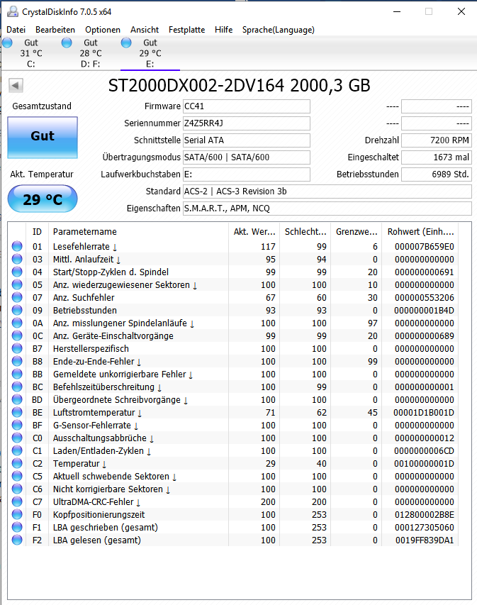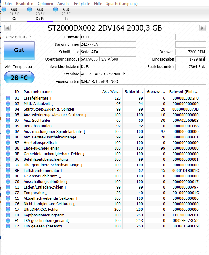Poste doch bitte mal den Screenshot von CrystalDiskInfo für die Platte. Lasse die Rohwerte in der hexadezimalen Anzeige und ziehe das Fenster soweit auf, dass alle Attribute und auch die Rohwerte vollständig sichtbar sind, also keine Scrollbalken mehr erscheinen. Bitte mache den Screenshot aus Windows und nicht mit einer Kamera vom Bildschirm und nur den Screen von CrystalDiskInfo, mit Alt+Druck erzeugt Windows einen Screenshot des aktiven Fensters in der Zwischenablage oder probiere mal die Tastenkombination: 'Windows Taste + Shift + S'.