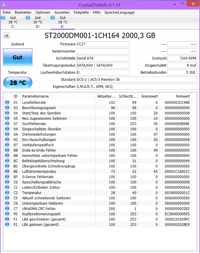 O-Saft-Killer, leider kann ich nicht laden was Du da bei mediafire.com abgelegt hast und habe ich auch sonst keine S.M.A.R.T. Werte der Platte gefunden. Poste also bitte mal den Screen von CrystalDiskInfo (die Portable Edition reicht und ist frei von Werbung), ziehe aber bitte das Fenster soweit auf, dass alle Attribute und auch die Rohwerte vollständig sichtbar sind und nutzen bitte die boardeigene Anhangfunktion.