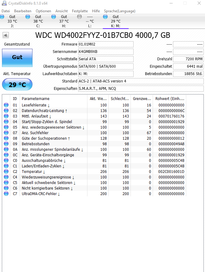 Holt schrieb:Vom Alter her, hat sie die Rente verdient und die 31 wiederzugewiesenen Sektoren deuten darauf, dass sie diese auch bald einfordern könnte. Achte darauf ob das mehr mehr werden, wenn ja und die Anzahl schnell steigt, eilt es. Ersetze sie aber unbedingt durch eine Platte mit Zulassung für den Dauerbetrieb, die aktuellen Modelle die keine haben, dürften kaum so lange durchhalten wie dieses alte Schätzchen. Nimm also eine IronWolf oder Red statt einer Barracuda oder Blue.