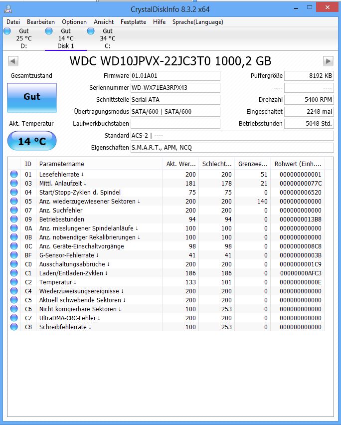 Die Werte sind alle bestens. Man sollte aber grundsätzlich keinem Datenträger alleine wichtig Daten anvertrauen, sondern muss immer, also zu jedem Zeitpunkt, ein ordentliches Backup aller Daten haben, die man nicht verlieren möchte.Nightmare25 schrieb:Das witzige ist das mir Crystal Disk Info die Festplatte als GUT meldet ... vertrauen habe ich aber irgendwie nicht mehr wirklich.
