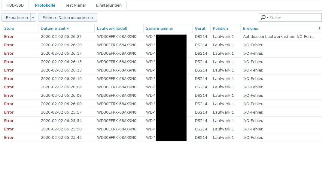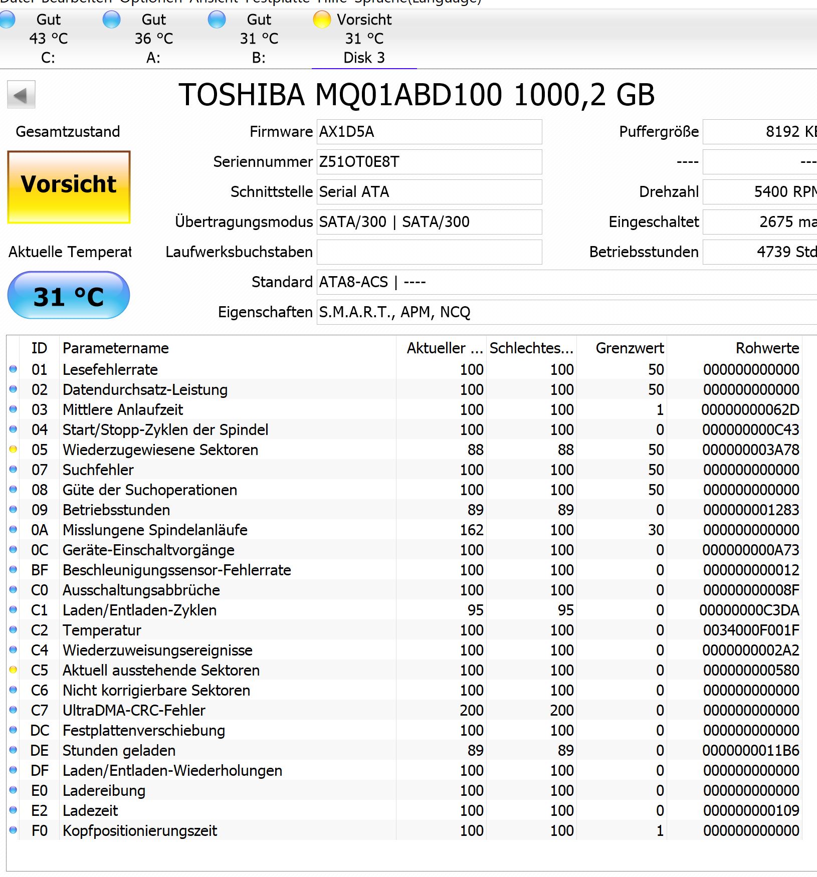 Platte wurde lange nicht benutzt und lag viel rum, eben frisch 2x mit f3write vollgeschrieben ohne Fehler und 2x ausgelesen mit f3read ohne Fehler. SMART Check über 2 Stunden auch problemlos. GSmartControl zeigt die Wiederzuweisungsereignisse als Fehler an, ChrystalDiskInfo nicht.