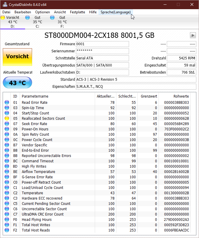 LuCk3r, die hat 0x0628 = 1576 wiederzugewiesene Sektoren, da der Aktuelle Wert noch 100 ist, dürfte es nur 197 physikalische Sektoren sein, der Rohwert aber die 8 mal so hoch weil, weil er die darauf emulierten logischen 512 Byte Sektoren zählt. Außerdem hat die ST8000DM004 SMR und damit ist es kein Wunder, wenn Entpacken ewig dauert und sich dabei dann auch keine Videos mehr gucken lassen. Als einfache Desktopplatte ist sie auch nur für 2400 Power-On-Hours pro Jahr gedacht, aber durchschnittlich fast 12 Stunden pro Einschaltung lassen befürchten, dass es hier mehr werden dürften. Die IronWolf 8TB wäre die bessere Wahl gewesen, die hat kein SMR und ist für den Dauerbetrieb zugelassen.
