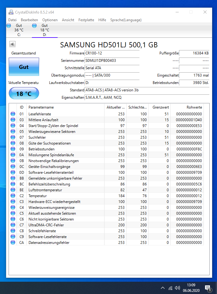 Die ist seit 2006 bei Geizhals gelistet, dürfte die vom Hersteller geplanten 5 Jahre Nutzungsdauer auch schon lange hinter sich haben. Ebenso zumindest die beiden Samsung, denn Samsung hat 2011 seine Festplattensparte an Seagate verkauft und da HDDs auch altern wenn sie nicht genutzt werden, bezieht sich dies durchaus auf Kalenderjahre. Klar halten sie meist länger, aber auch nicht ewig. Die 750GB Samsung und die WD haben ein paar Lesefehler und irgendwo könnte es im System ein defektes SATA Datenkabel geben, achte bei allen nach dem Zusammenbau darauf ob der Rohwert vom Attribut C7 bei einer ansteigt.Ponderosa schrieb:Meiner Meinung nach taugt die nur noch zum Entsorgen.