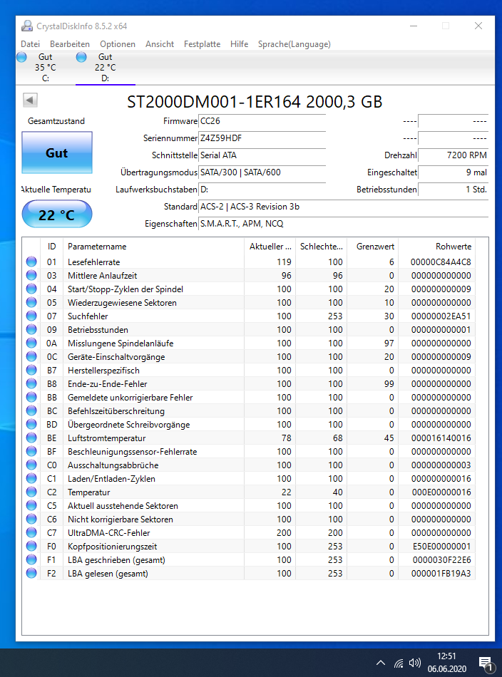 Sorry, dass es kein CrystalDiskInfo Screenie ist, aber die Key/ Values sollten die gleichen sein.