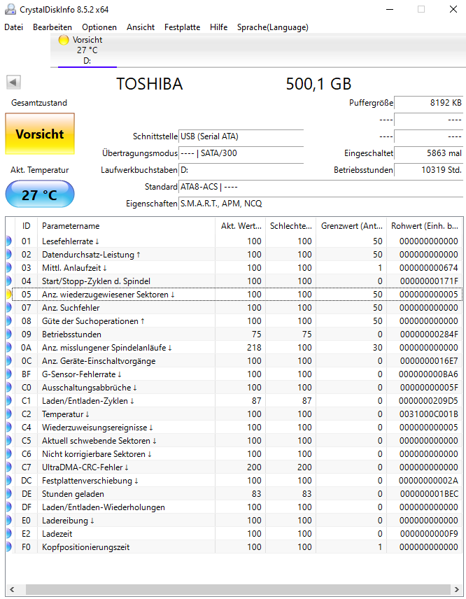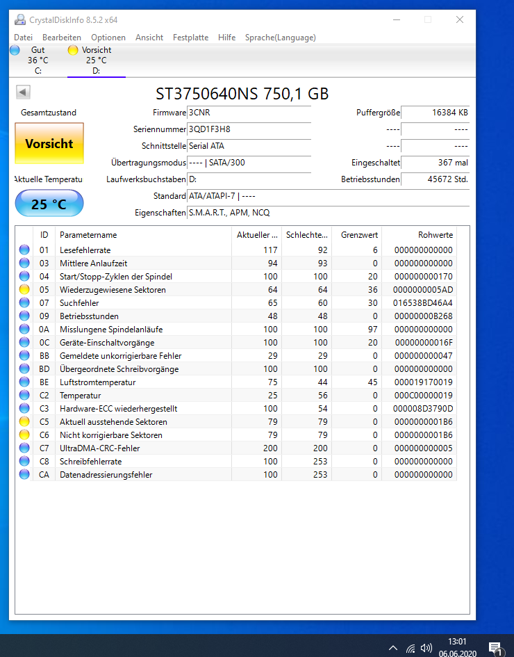 Ich habe da eine 750GB HDD Seagate Barracuda die laut Crysta Disk Info mit Vorsicht gezeichnet ist.