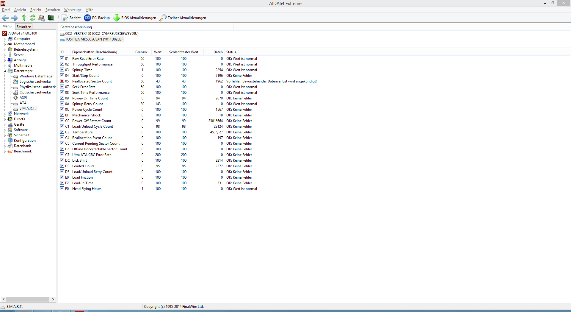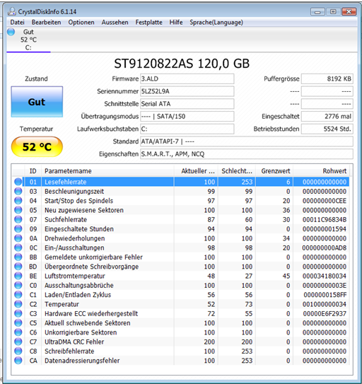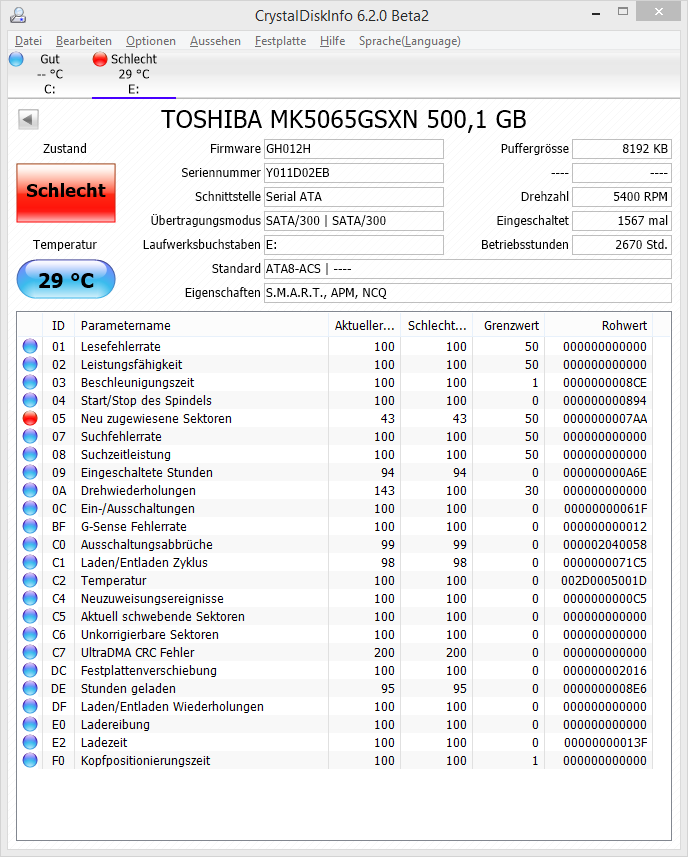 Hallo, ich habe ein S.M.A.R.T Problem und zwar wird mir von Windows und vom BIOS immer eine Fehlermeldung ausgespuckt. Dies scheint mit dem Reallocated sectors count zusammen. Ich würde gerne wissen, ob meine Festplatte wirklich bald den Geist aufgibt, oder ob ich sie noch verwenden kann.