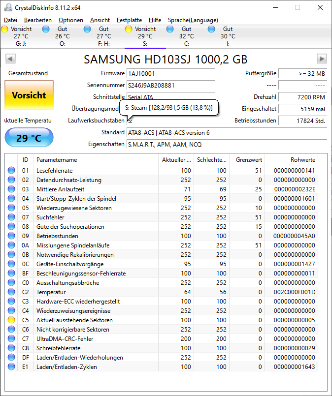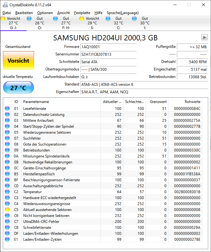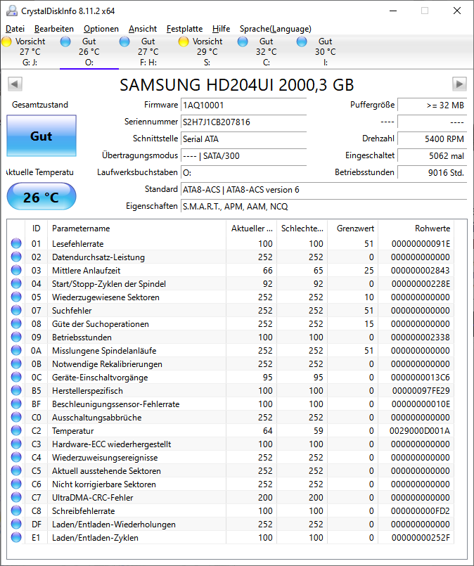 Mich würde interessieren, wie die SMART-Werte dieser alten Festplatte zu bewerten sind: