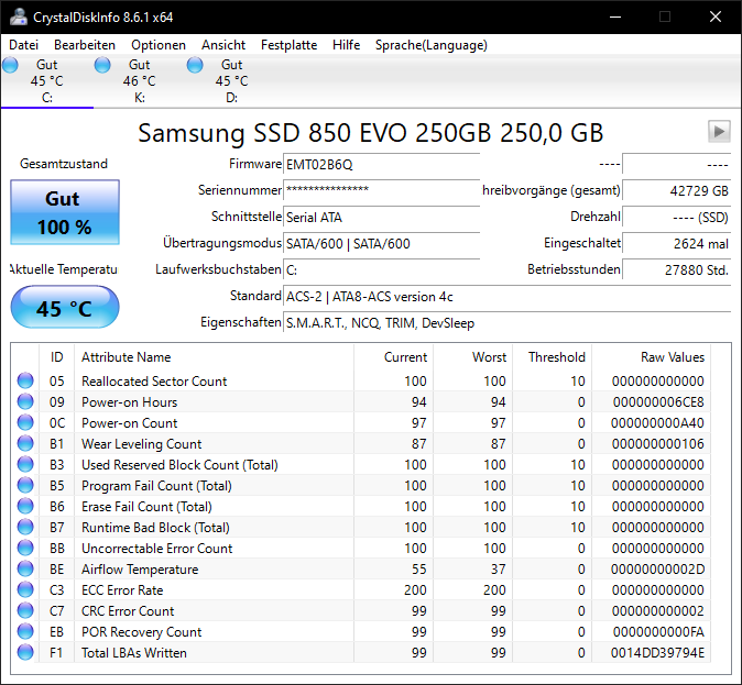 SSD850evo: 2 CRC Fehler, das ist das SATA Datenkabel, steigt der Wert weiter das Kabel tauschen.