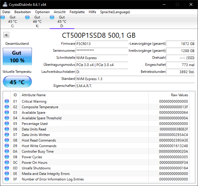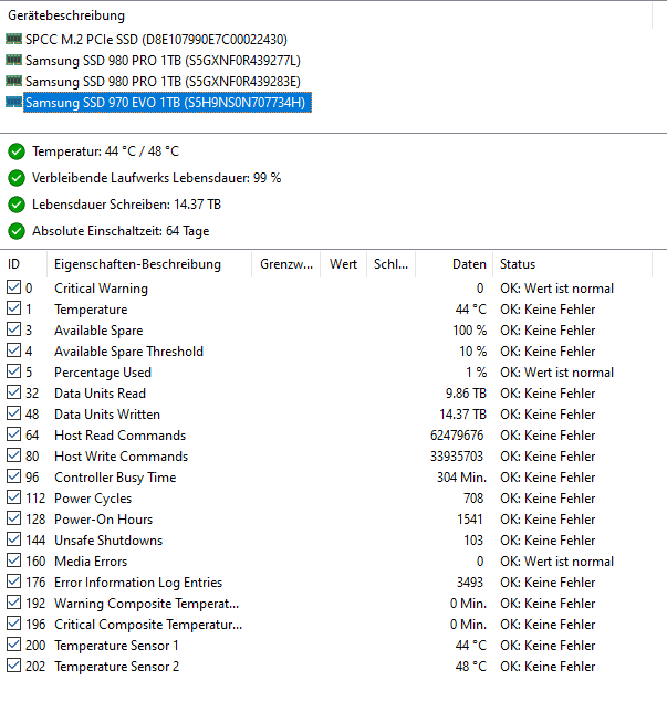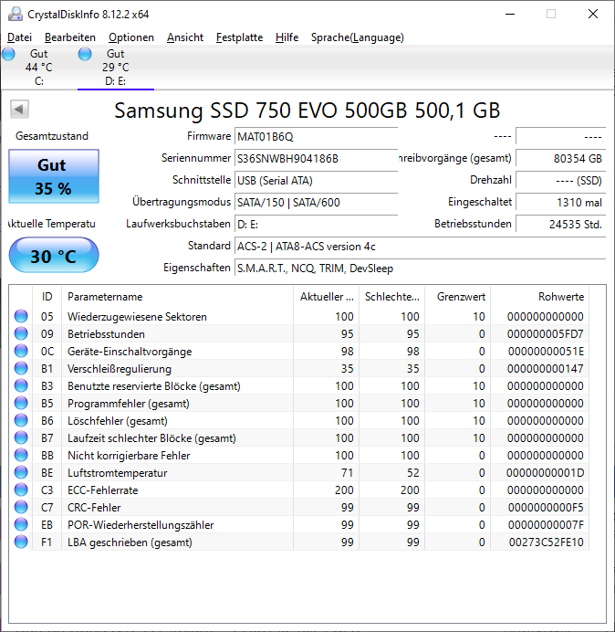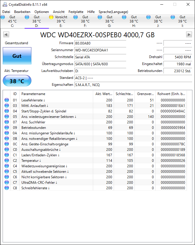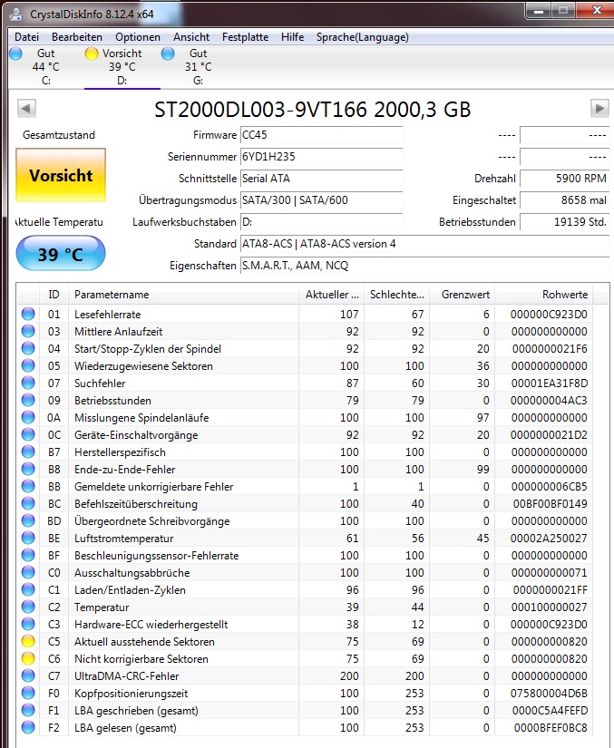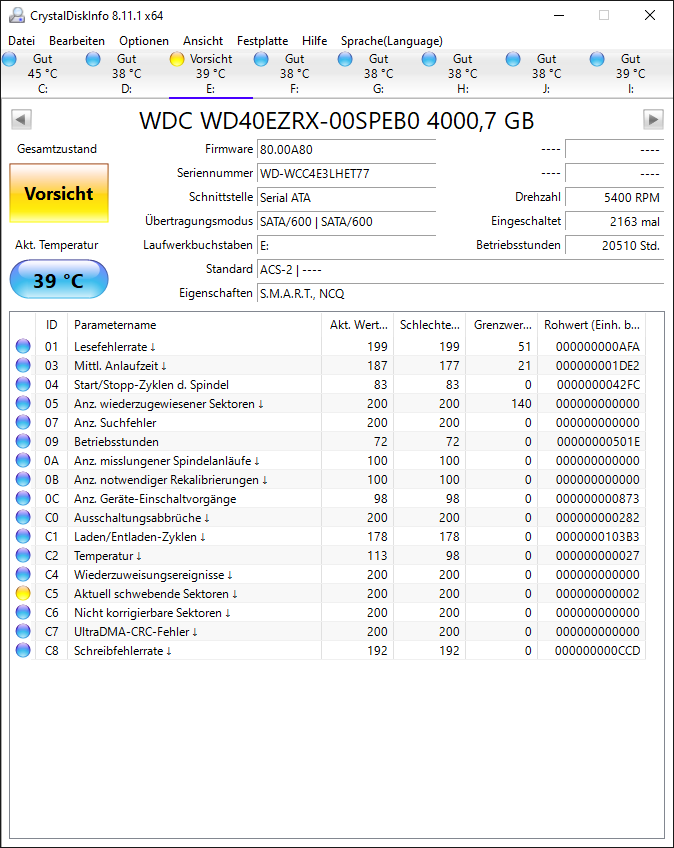 E hat neben den 2 schwebenden (= nicht lesbaren) Sektoren und 2.810 Lesefehlern auch 3.277 Schreibfehler, bei denen die Schreib/Leseeinheit ausserhalb ihrer vorgesehenen Position war. E sollte zeitnah ersetzt werden.