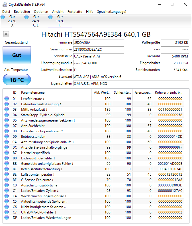 Die HDD war vorher in einem Notebook eingebaut? Ich frage wegen der G-Sensor-Fehlerrate. Das Notebook war während des Betriebs relativ oft mal mindestens kleinen und mittleren Stößen ausgesetzt, nicht wahr? Das wären 7848 Auslösungen bei 5341 Betriebsstunden!