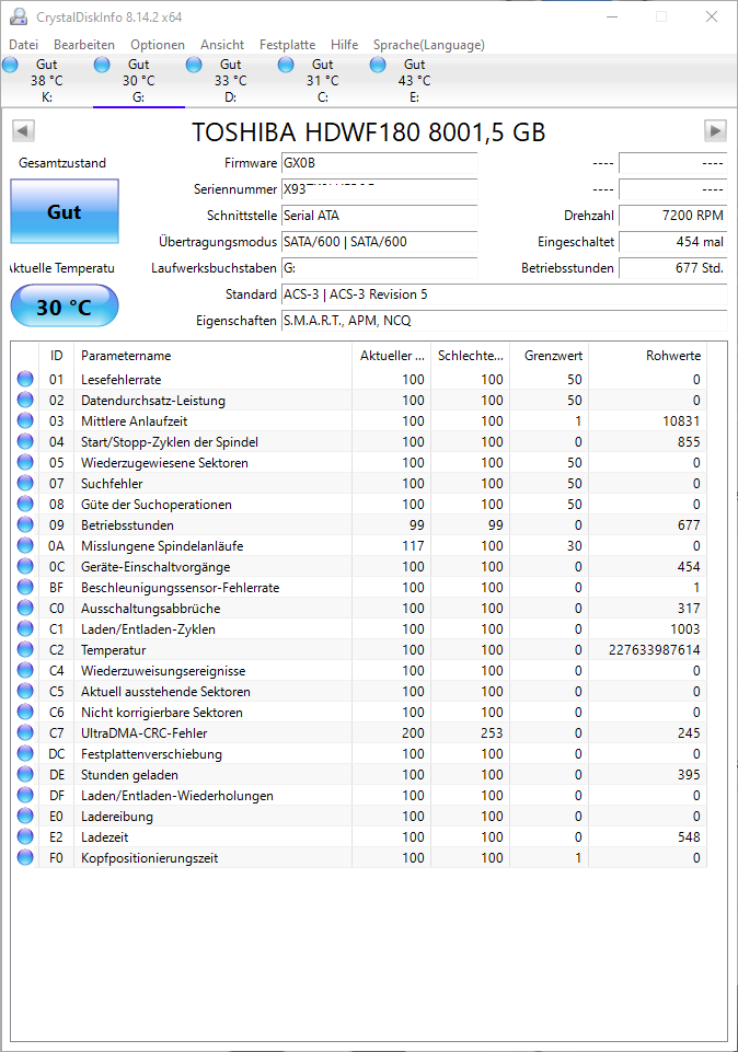 621 defekte Sektoren wurden durch Reservesektoren ersetzt (ID 05), weitere 3353 Sektoren können nicht gelesen werden (ID C5/C6), ob die defekt sind zeigt sich erst nach dem nächsten Beschreiben selbiger.
