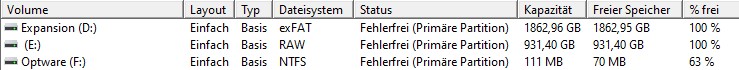 So sieht das aus (die Partition E: ist eigentlich nahezu voll):
