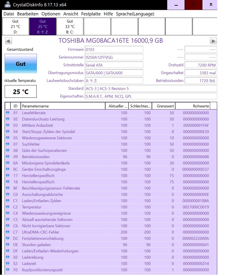 Backup gemacht auf SSD umgestellt dann. Danach die 1 TB behandelt. CHKDSK, HDD REG, Viktoria, mehrmals langsam formatiert. Was ich mit CDI feststellte war, die ausstehenden und nicht korrigierbaren Sektoren waren zwar weg, ABER die wieder zugewiesenen Sektoren stiegen immer weiter an.