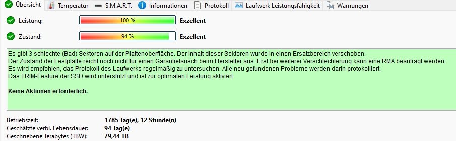 •Intel: 3 wiederzugewiesene Sektoren, für 42.850 Betriebsstunden noch gut.