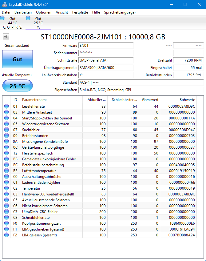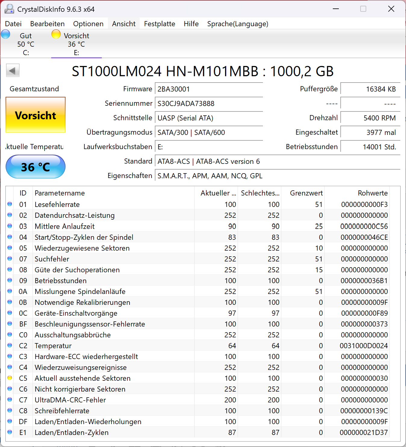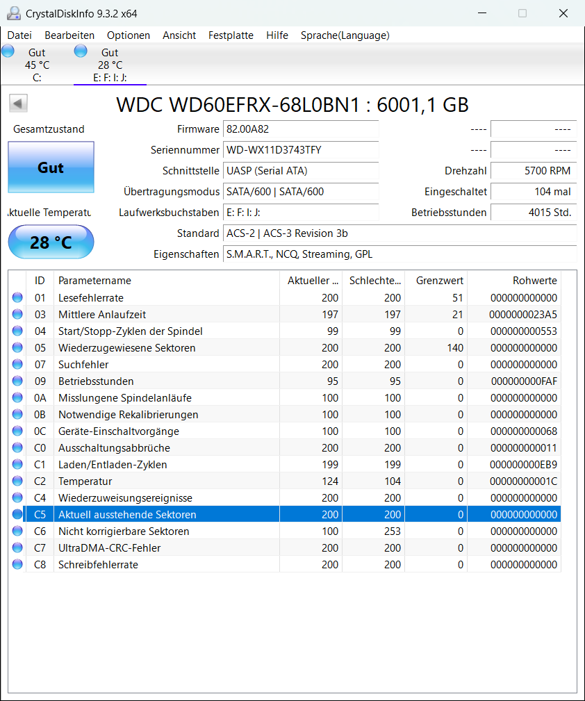 Ich kann einige Daten nicht mehr öffnen oder kopieren, ich habe mit CDI festgestellt, dass der Wert bei C5 Aktuell ausstehende Sektoren Gelb ist. Leider kann ich mit der Meldung nicht viel anfangen.