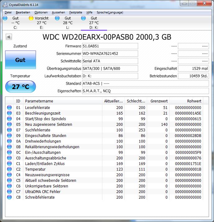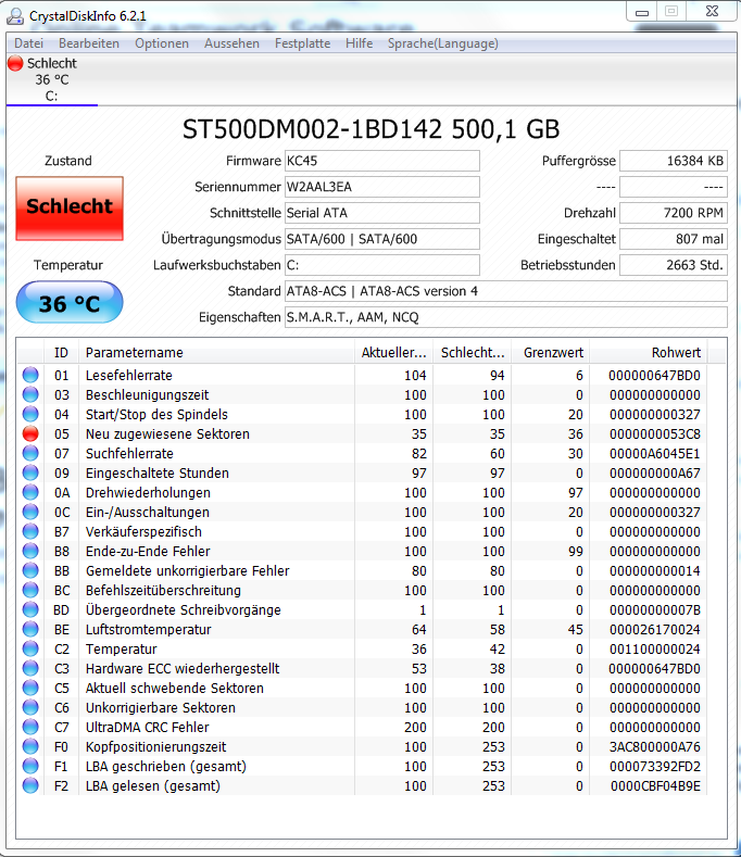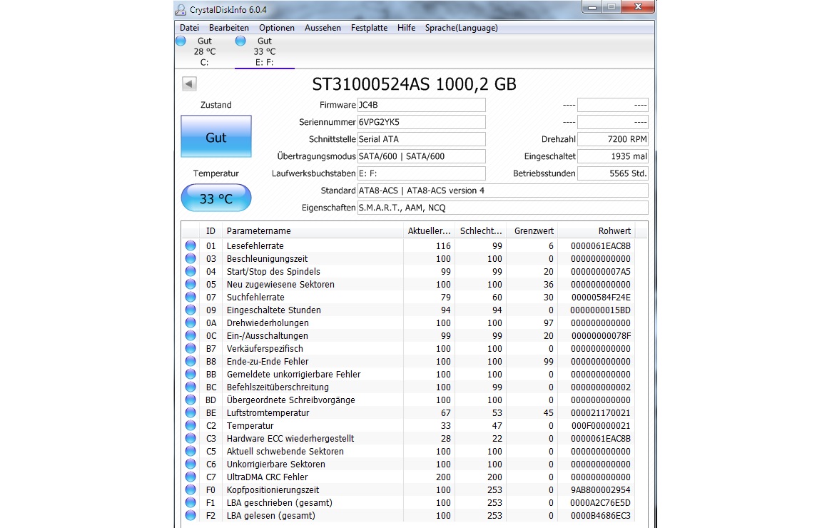 Die neuwertige Festplatte in dem PC scheint nicht kaputt zu sein. Hier die Smart-Werte zur Überprüfung: